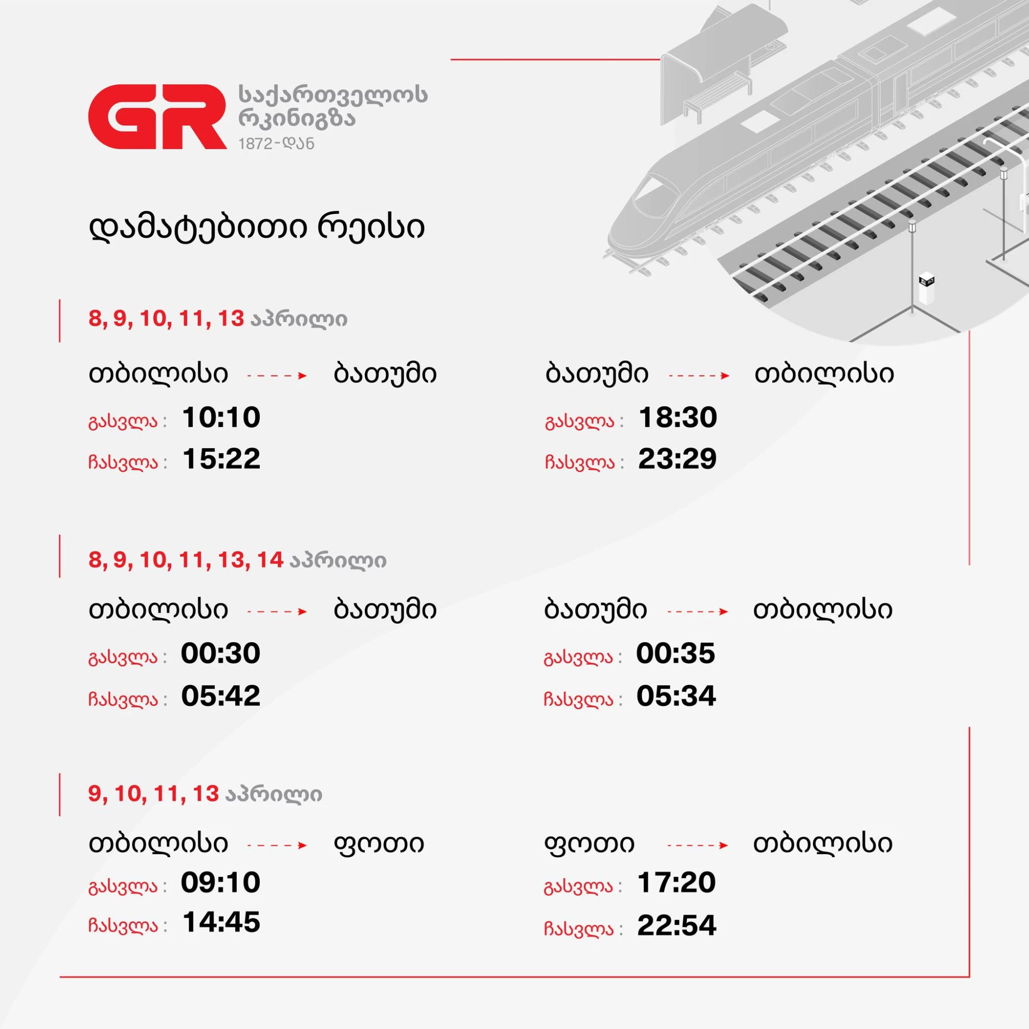 აღდგომის დღესასწაულთან დაკავშირებით, გაზრდილი მგზავრთნაკადის გამო, საქართველოს რკინიგზა 8 აპრილიდან 14 აპრილის ჩათვლით, რეისებს ამატებს.