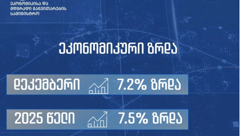2025 წელს ეკონომიკური ზრდა 7.5%-ით განისაზღვრა, ხოლო დეკემბრის თვეში საქართველოს ეკონომიკის ზრდამ 7.2% შეადგინა.