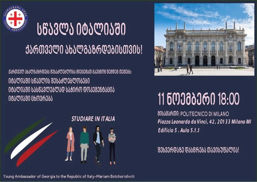 11 ნოემბერს, იტალიის რესპუბლიკაში, საქართველოს ახალგაზრდა ელჩის, მარიამ ბოჭორიშვილის ინიციატივითა და Politecnico di Milano-ს მხარდაჭერით, ქართველ ახალგაზრდებთან ახალგაზრდა ელჩის შეხვედრა გაიმართება.