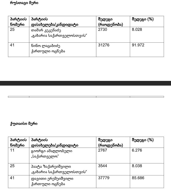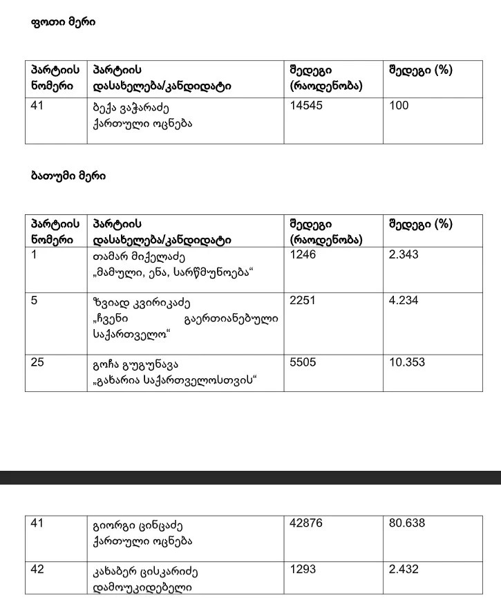 მუნიციპალიტეტის ორგანოთა არჩევნები დასრულდა - უკვე დათვლილია ყველა საარჩევნო უბნის (3 061 უბნის) შედეგი. დეტალური ინფორმაცია განთავსებულია ცესკოს ვებგვერდზე.
