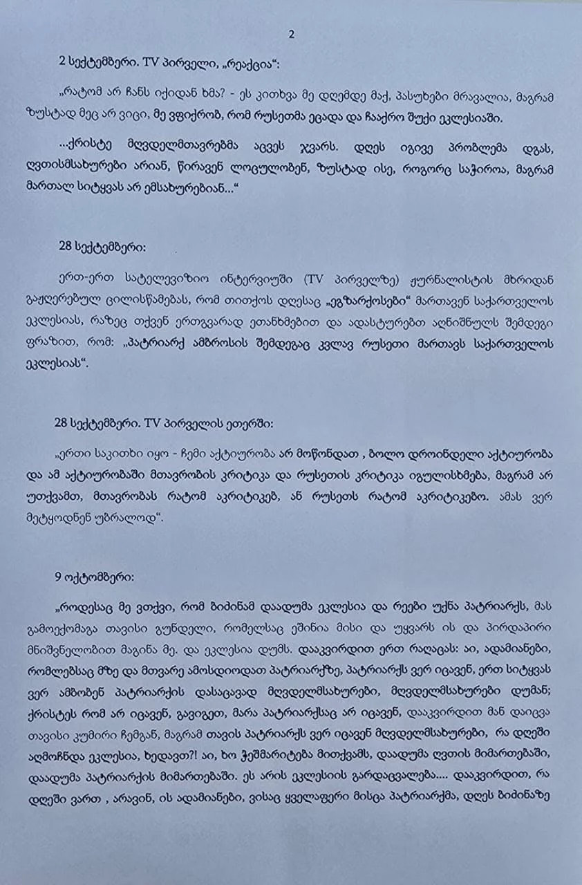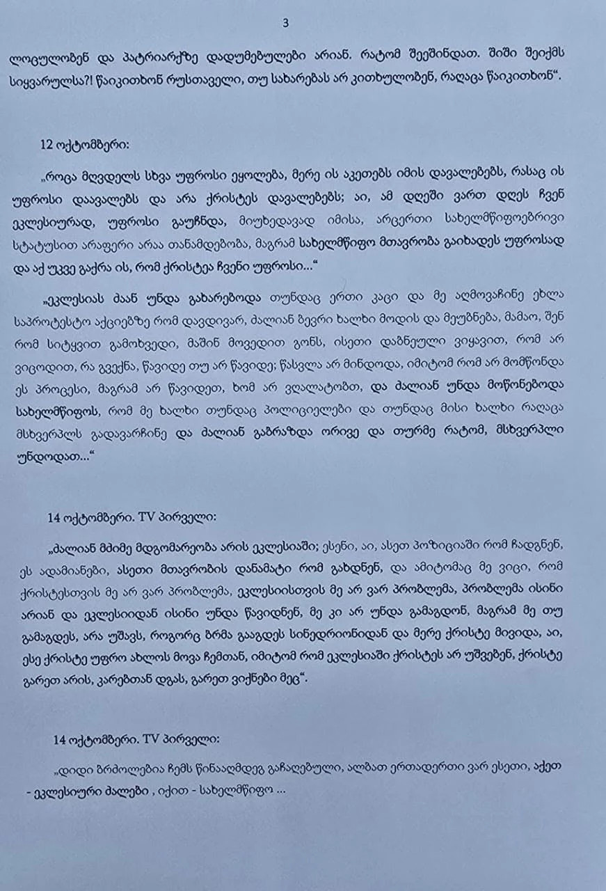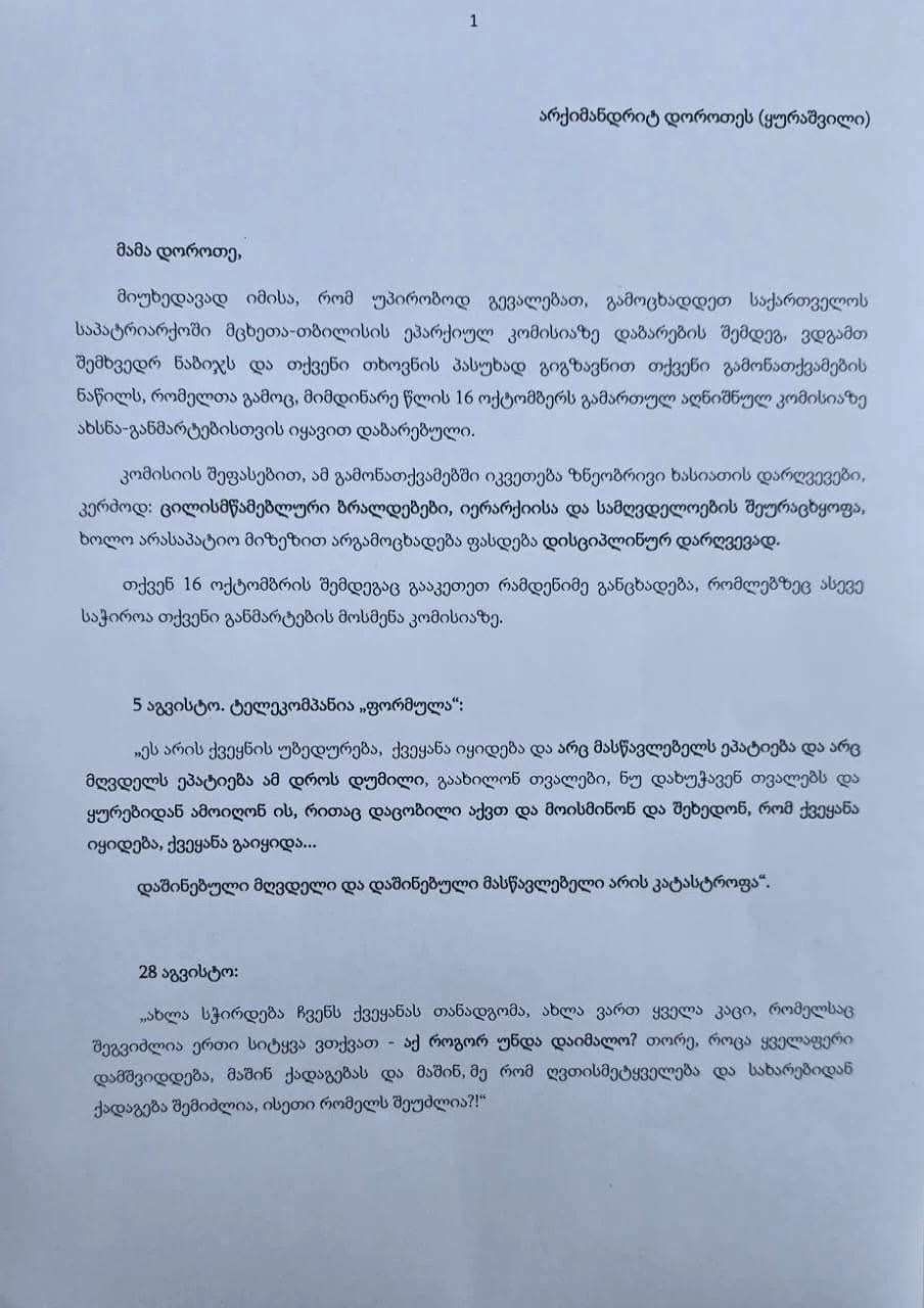 „თუ რაიმე შეკითხვა არსებობს მამა დოროთეს მიმართ, არსებობს კომისიის მხრიდან და ფუჭი მცდელობაა მამა დოროთემ მე მომაკუთვნოს რაიმე პირადი დაინტერესება. ვასაჯაროვებ 25 ოქტომბერს პატრიარქის მდივნის, დეკ. მიქაელ ბოტკოველის ხელმოწერით გაგზავნილ წერილს.