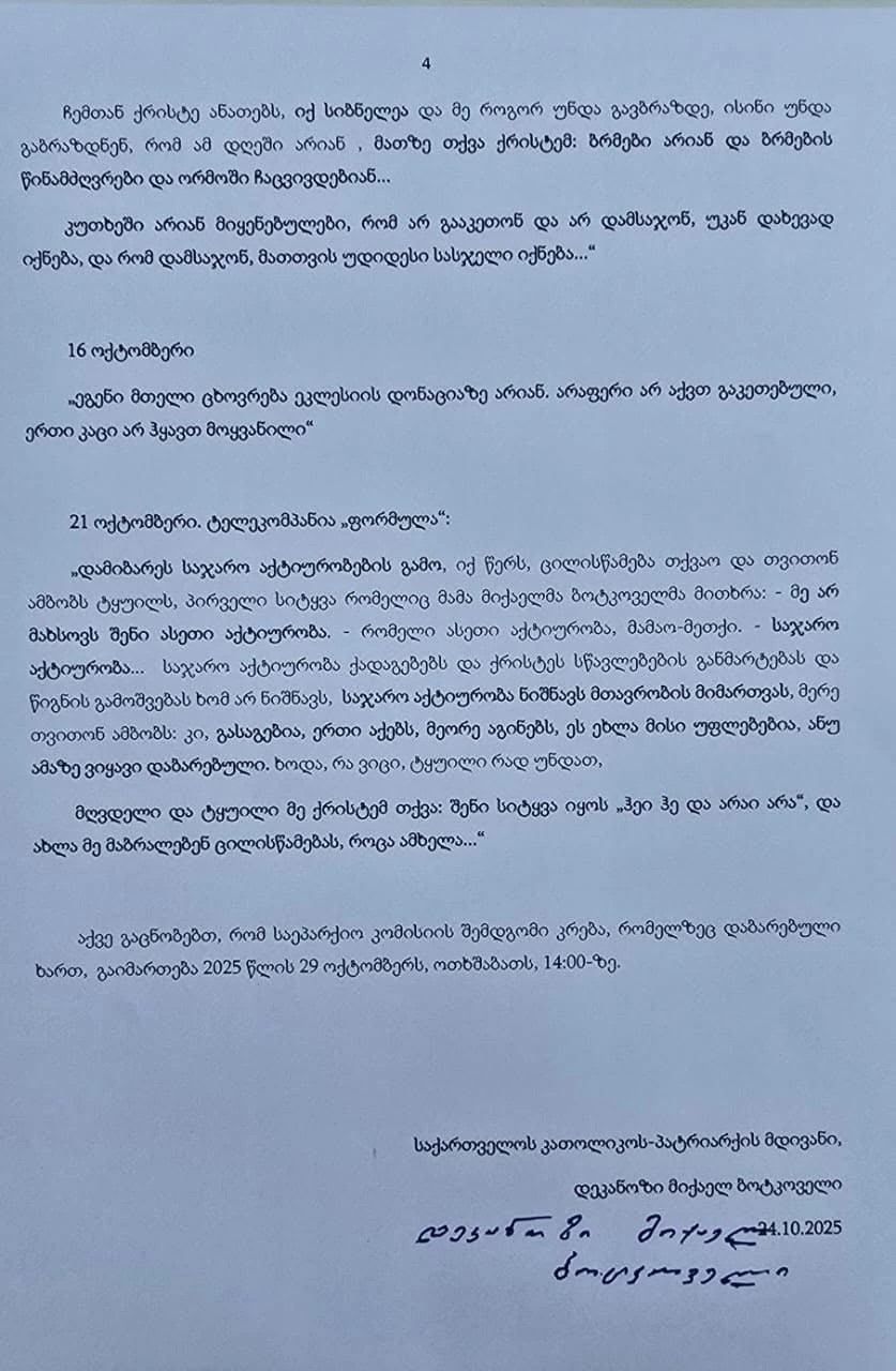 დეკანოზი ანდრია ჯაღმაიძე 25 ოქტომბერს პატრიარქის მდივნის მიქაელ ბოტკოველის ხელმოწერით გაგზავნილ წერილს ასაჯაროებს.