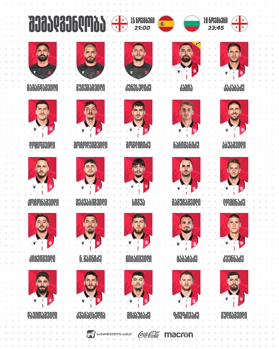 ესპანეთთან და ბულგარეთთან მატჩებისთვის მან 25 ფეხბურთელი გამოიძახა. ორმა ფეხბურთელმა სანაკრებო გამოძახება პირველად მიიღო. მათ შორის არიან ესპანური „კადისის“ 25 წლის მოთამაშე იური ტაბატაძე და სლოვაკური „ჟილინას“ 20 წლის ფეხბურთელი ალექსანდრე ნარიმანიძე. საქართველოს ნაკრები მატჩებისთვის მოსამზადებელ ეტაპს 10 ნოემბერს, თბილისში დაიწყებს.