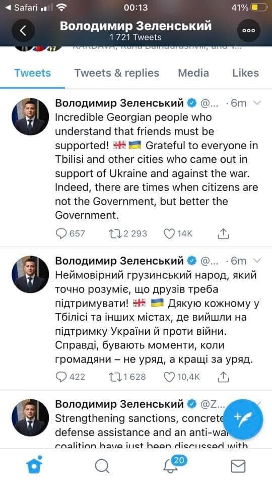 „გულს მიჩუყებს ასეთ მდგომარეობაში მყოფი ზელენსკი, რაღაც მომენტში მაინც რომ იცლის და ჩვენს უბრალოდ რუსთაველის გამზირზე მისვლას ეხმაურება“ - ნიკოლოზ რაჭველი