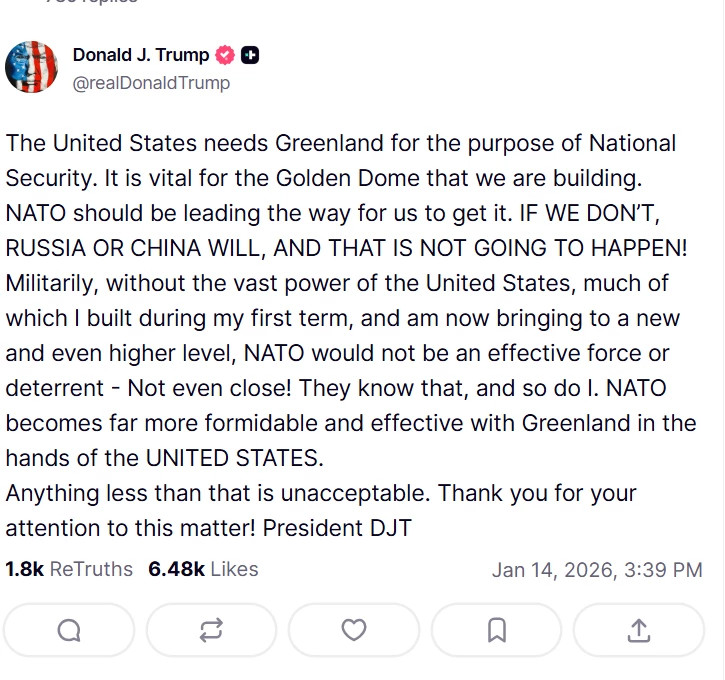 „ამერიკის შეერთებულ შტატებს გრენლანდია ეროვნული უსაფრთხოების უზრუნველსაყოფად სჭირდება. ის სასიცოცხლოდ მნიშვნელოვანია ოქროს გუმბათის მშენებლობისთვის. ნატო ამ პროცესს სათავეში უნდა ჩაუდგეს. თუ ჩვენ ამას არ ვიზამთ, ამას გააკეთებენ რუსეთი ან ჩინეთი, რაც არ უნდა მოხდეს! სამხედრო თვალსაზრისით, შეერთებული შტატების უზარმაზარი ძალის გარეშე, რომელიც მე პირველი ვადის დროს შევქმენი და ახლა ახალ საფეხურზე ამყავს, ნატო ახლოსაც კი ვერ მივიდოდა ეფექტურ შემაკავებელ ძალასთან! მათ და მეც ეს ვიცით. თუ გრენლანდია აშშ-ის ხელში აღმოჩნდება, ნატო მეტად ძლიერი და ეფექტური გახდება. სხვა დანარჩენი მიუღებელია“, - წერს ტრამპი.