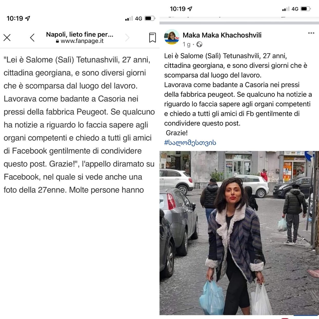 „სამი რთული დღე, რომელთა განმავლობაშიც, 22 იანვარს ნეაპოლიდან გაუჩინარებულ 27 წლის, წარმოშობით ქართველ გოგონას ეძებდნენ. ის კაზორიაში მოხუცის მომვლელად მუშაობდა. გოგონა სახლიდან გავიდა და უკვალოდ გაუჩინარდა, ოჯახმა მალევე განგაში ატეხა. გაკეთდა განცხადება პოლიციაში და გავრცელდა ინფორმაცია სოციალურ ქსელში. საბედნიეროდ ყველაფერი კარგად დასრულდა და გოგონა ცოცხალი და ჯანმრთელი იპოვეს.