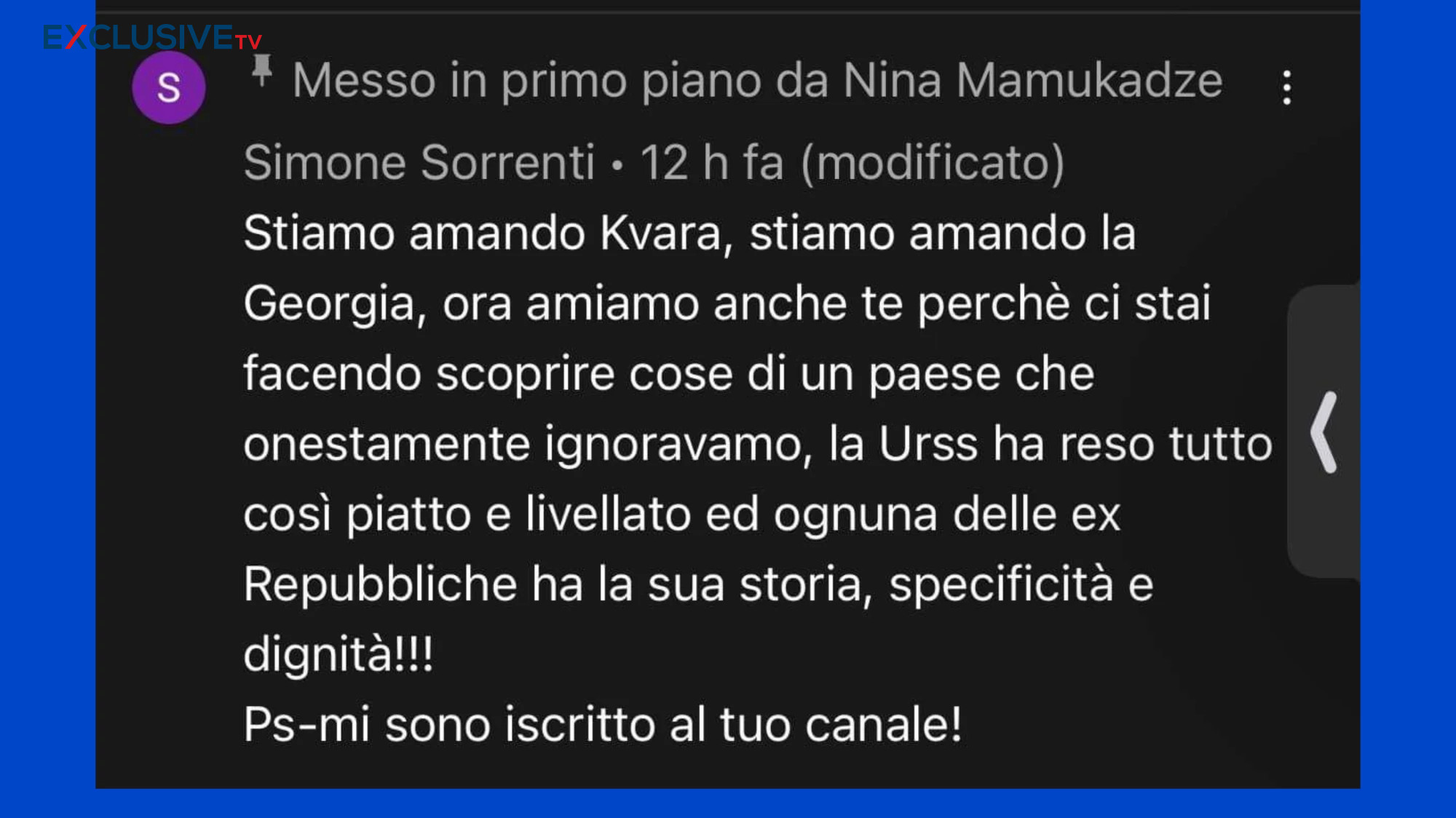 ასე იწყება იტალიელი მამაკაცის სიმონე სორეტის წერილი, რომელიც exclusivetv.ge-ს ჟურნალისტის, იტალიის ბიუროს ხელმძღვანელის ნინა მამუკაძის მიერ, ხვიჩა კვარაცხელიას შესახებ მომზადებულ რეპოტაჟს გამოეხმაურა.